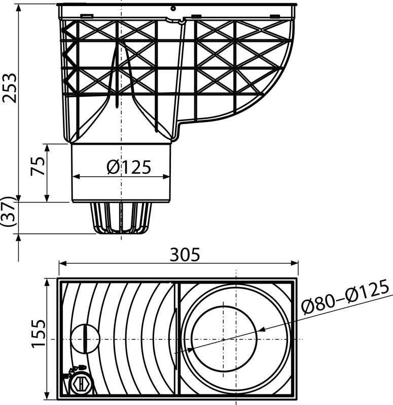 - Lefolyó test vízszintes csatlakozással Ø125 mm