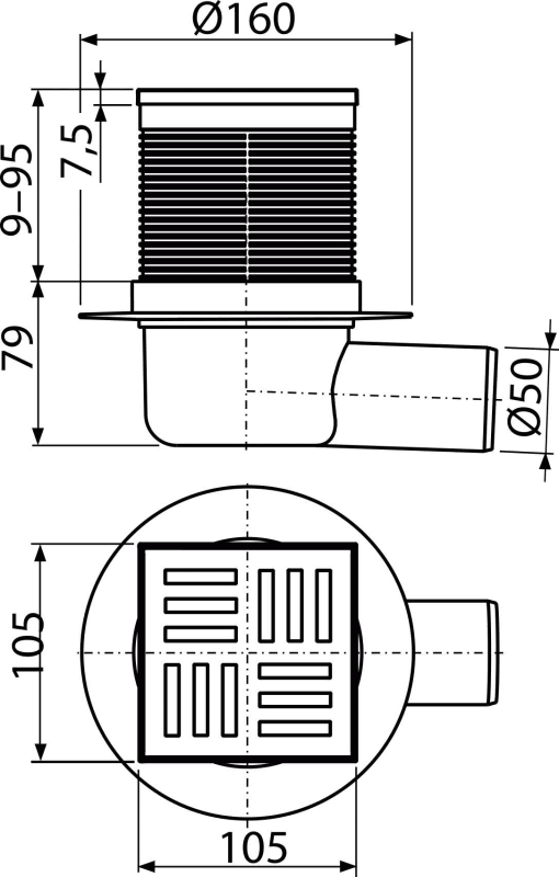- A padlóösszefolyó teste oldalsó Ø50 mm