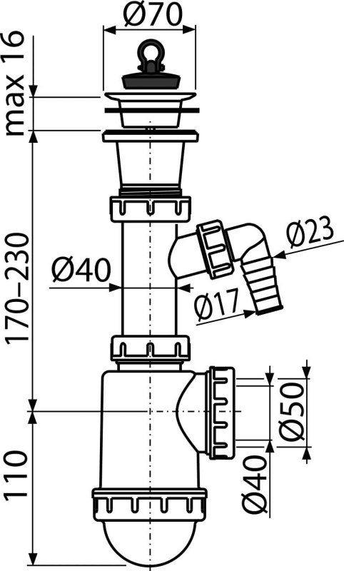 - Előkészített szennyvíz kimenet a szennyvízcső csatlakozásához Ø50 mm vagy 40 mm