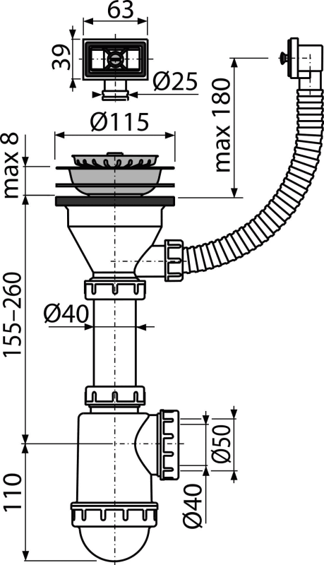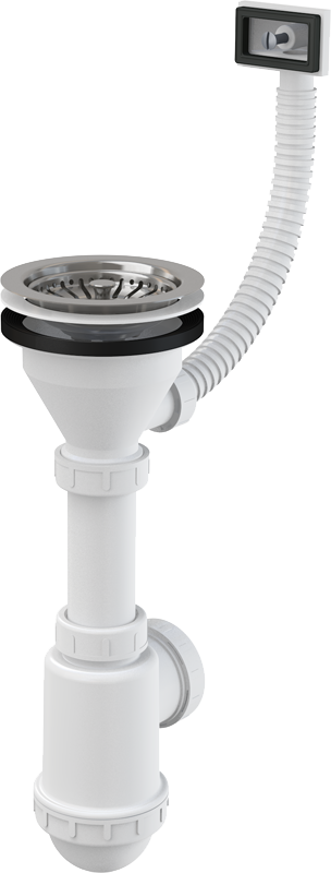 Mosogató szifon rozsdamentes leeresztővel DN115 és flexibilis túlfolyóval