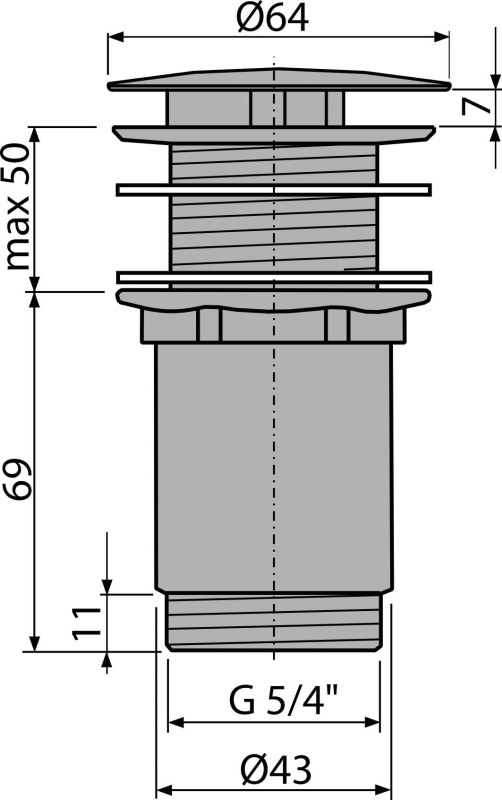 CLICK/CLACK nélküli mosdó leeresztő 5/4", fémből, nagy dugóval, túlfolyó nélküli mosdókhoz