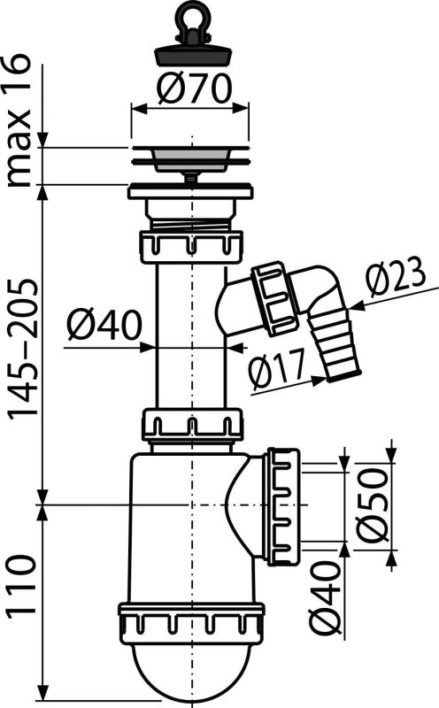 - Előkészített szennyvíz kimenet a szennyvízcső csatlakozásához Ø50 mm vagy 40 mm