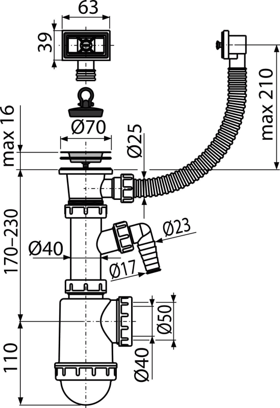 Mosogató szifon rozsdamentes leeresztővel DN70, flexibilis túlfolyóval és csatlakozóval